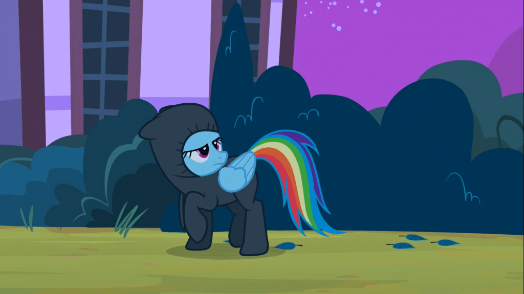 And she does exactly that, sporting a black jumpsuit but keeping her rainbow tail visible for… some reason, I don’t really care, that’s not important. What is important is the extreme lengths she’s willing to take for the sake of her new favorite work of media. She’s willing to sneak into a hospital undercover if it means getting to finish her Daring Do book. I know exactly what it’s like to take extreme lengths for a work of media I love—the very words you are reading right now are a direct result of that effect.