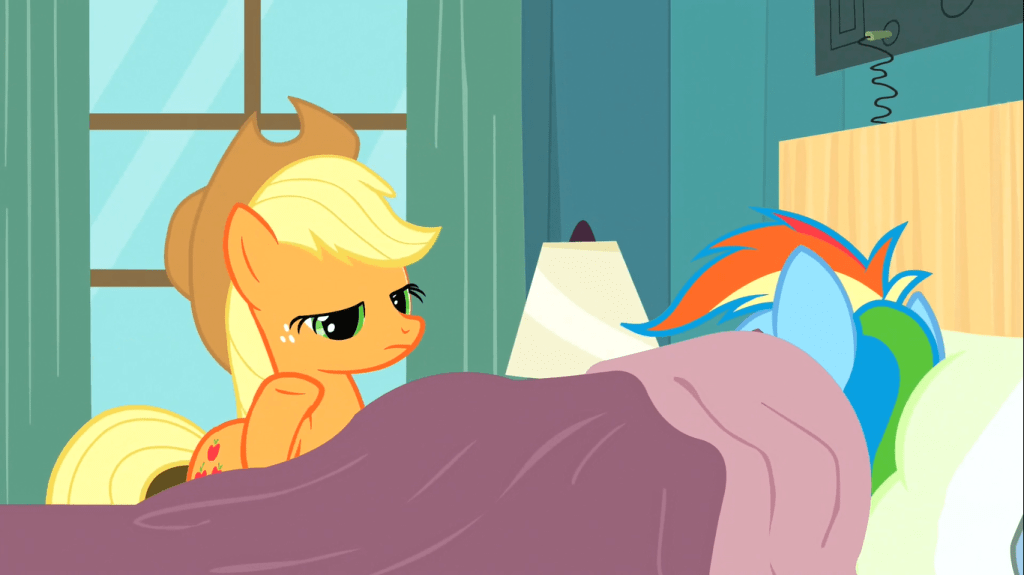 - Out of Rainbow Dash’s friends, we don’t get to see how Fluttershy and Applejack were woken up, so I’m going to guess why they’re awake this late. Applejack had to stay up all night doing farm work because she lost a bet with Big Macintosh, and Fluttershy was woken up by Angel since he could sense that mischief was nearby. I say this because Fluttershy is wearing pajamas and Applejack isn’t.