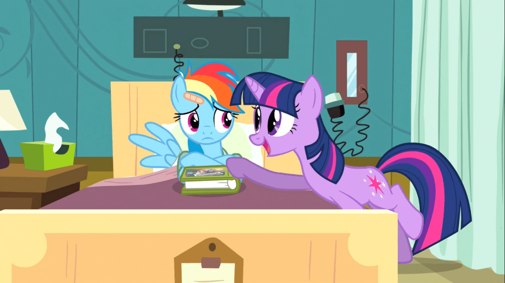 Twilight Sparkle then has a brilliant idea. She sees a nurse pony carrying a bookshelf, takes one of the books out, and gives it to Rainbow Dash.