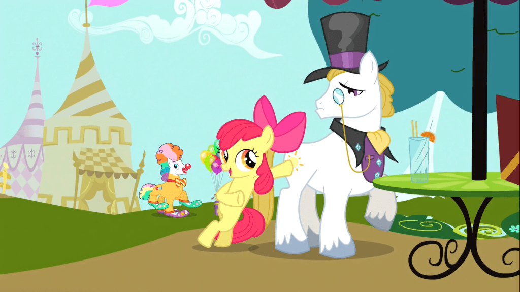 Sweetie Belle shows a bit of her big sister’s inclination towards romantic matters by excitedly proposing to find Cheerilee a special somepony, which the other Crusaders blindly agree to. These innocent kids mistakenly think it’s right for them to meddle with an adult’s love life, and though they have the best intentions, it still shows how childish they are at this point. They get a second shot at helping with an adult pony’s love life in season 7 (the episode Hard to Say Anything), and I’ll have more to say on that in the episode’s overall thoughts.