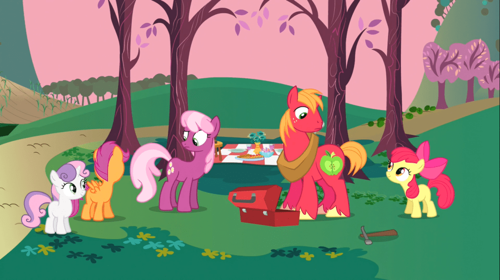 The Cutie Mark Crusaders set up a picnic for Big Mac and Cheerilee, and the two turn out to have arrived through trickery: Cheerilee was called over supposedly to identify a tree, and Big Mac was called to fix a gazebo. The Crusaders then demonstrate how they’re much less subtle than they think: