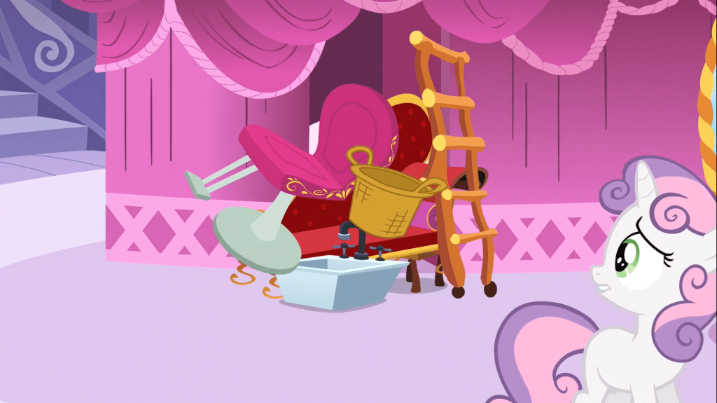 - When Sweetie Belle mentions “chaos reigning” in the story, I wonder if she’s unknowingly referring to Discord’s rule of Equestria and providing a hint as to how he managed to take over? Man, this is probably completely basic lore to most people who care enough about MLP to be reading these posts. I’m such a disgrace to MLP’s fandom, I’m sorry.