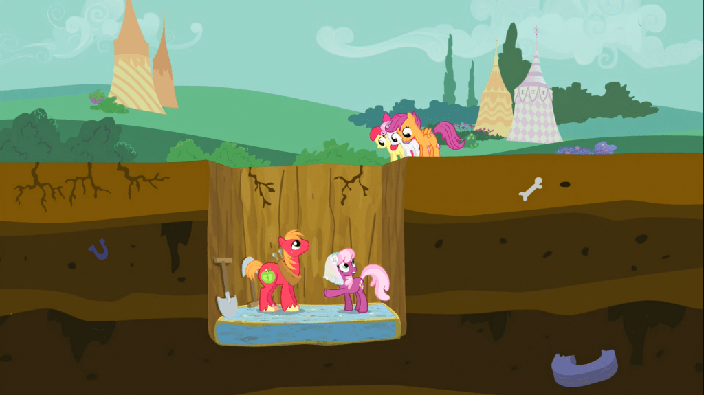 I’m just going to pretend it makes sense for Sweetie Belle and Scootaloo to have dug such a huge, cubic pit.