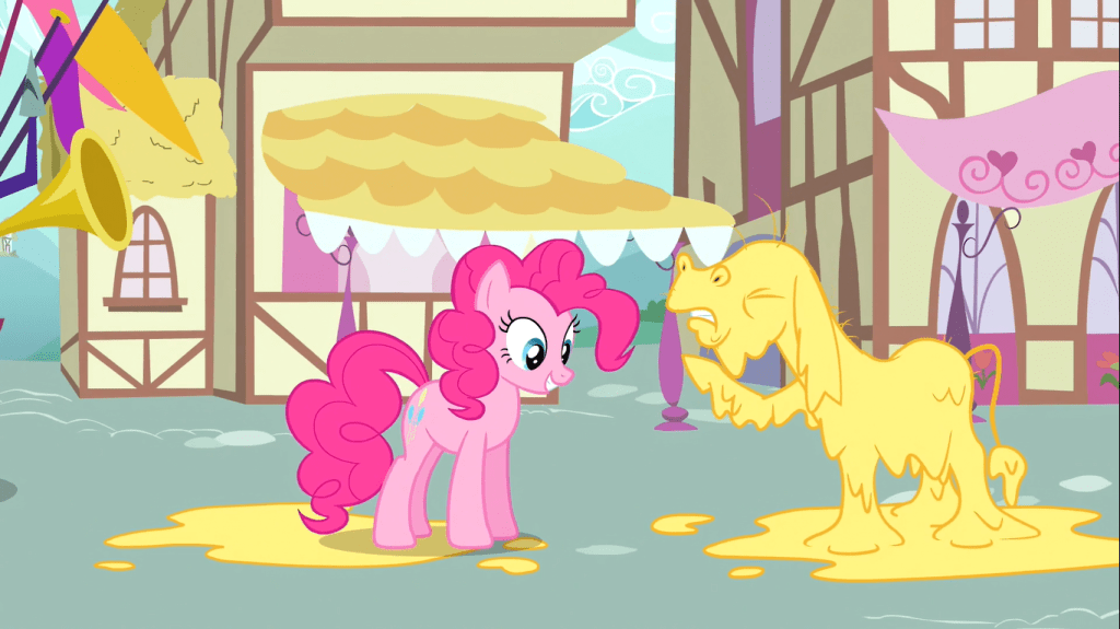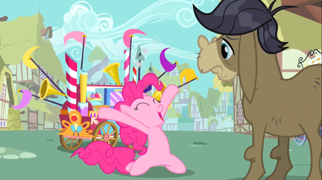 That said, me forgetting about this episode’s intro scene may have something to do with how it’s unrelated to the rest of the episode, especially with the part following the theme song where Pinkie Pie greets numerous inhabitants of Ponyville and shows how universally beloved she is. This scene doesn’t come off as unbearably sugary, at least not to me because Pinkie Pie is such a laugh riot.
