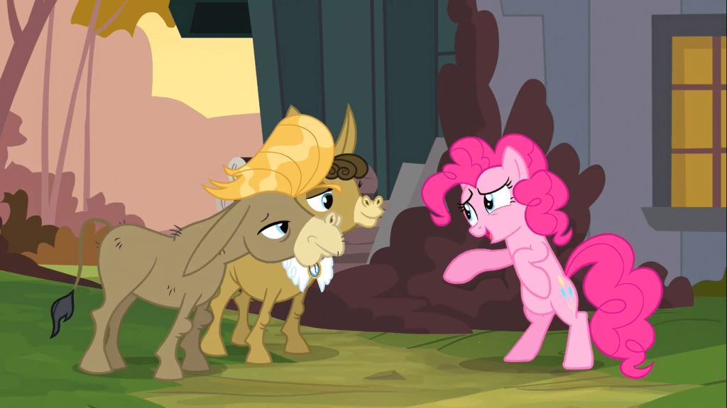 After taking Cranky to the spa, Pinkie Pie gives him a wig Rarity made as a gift, thinking that will make it up to him and make him finally be her friend, even though she was the one who ruined his wig in the first place. This comes off as incredibly desperate on Pinkie Pie’s part and shows how much of an impasse she’s on; she wants to do anything she can to be this donkey’s friend, and it isn’t working out. It won’t be long until she realizes that she’ll have to do things very differently with him.