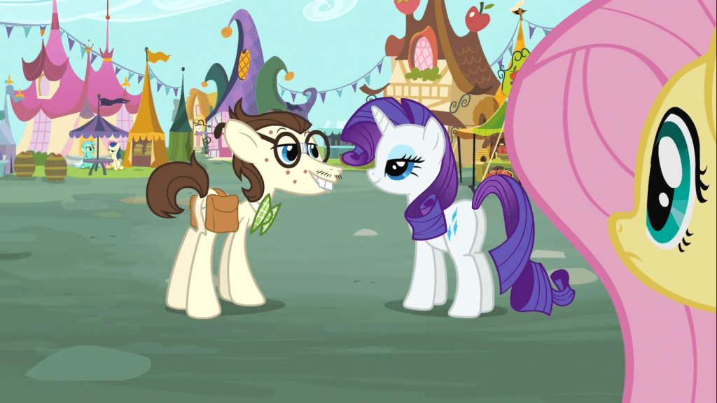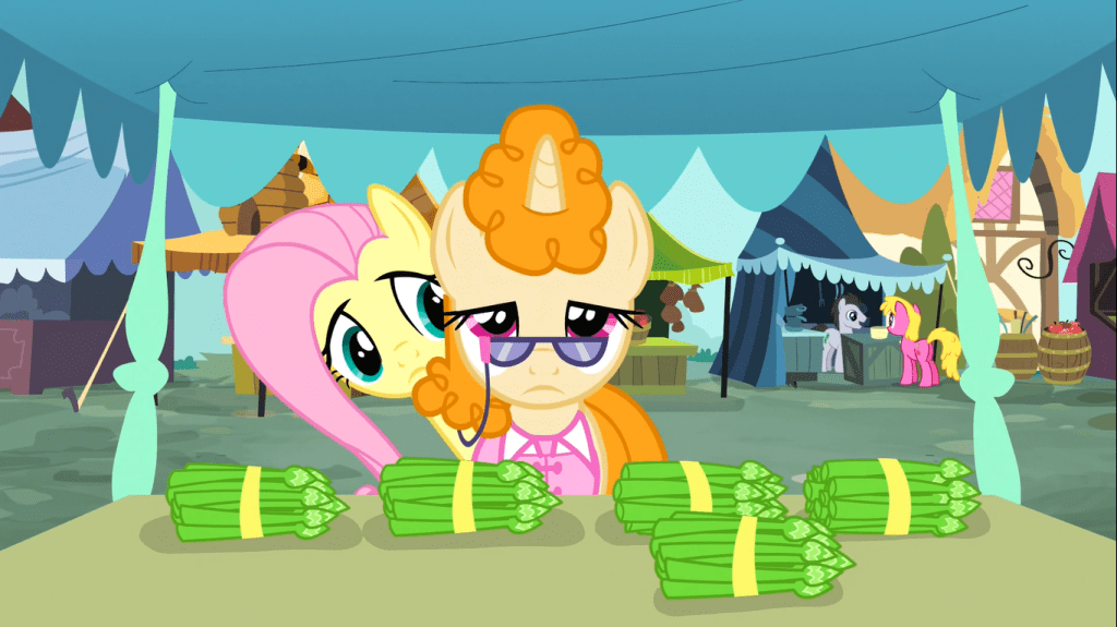 Rarity’s flavor of sweet talking is normally fun and satisfying to watch, but here she comes off as a jerk by manipulating this nerdy-looking guy into selling her the last of the store’s asparagus which he just bought. It can’t always be like this when Fluttershy is shopping for food—if it was, then how would she ever get anything done? Did Ponyville get afflicted with a curse that turns everyone besides Fluttershy into brutal jerks? Is there a tie-in with some other episode that could explain why everyone in Ponyville is acting like this? It’s so much more fun to come up with ridiculous justifications for this episode’s events than to acknowledge that they make no sense.