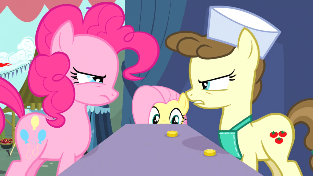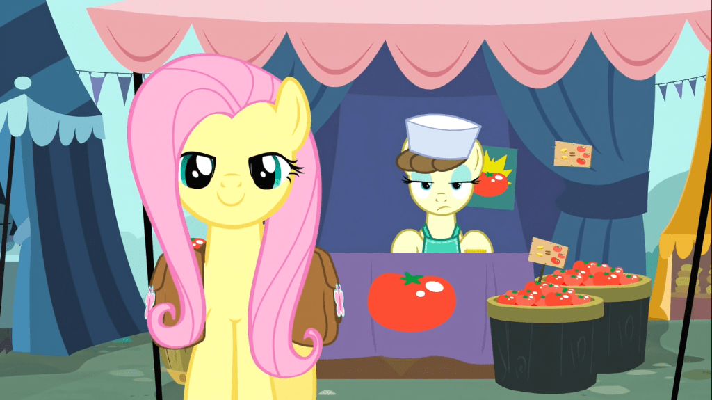 And yet, Pinkie Pie uses a back-and-forth argument to trick the tomato vendor into only charging one bit for three tomatoes. Is this really a good message to be telling kids, to scam others out of their money?! Fluttershy is doing nothing wrong here; she’s just an awkward bystander, unsure what to make of this newfound behavior in her two friends. Perhaps she desperately hopes the other three Mane 6 members are still their normal selves.