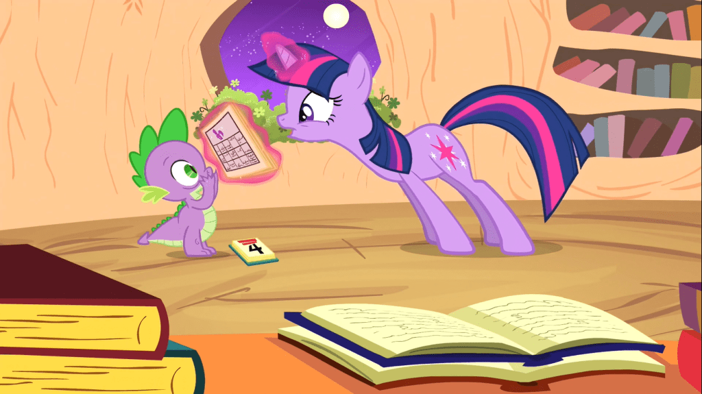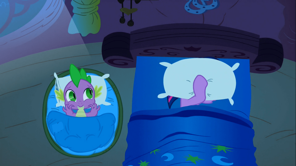 This episode begins similarly to Lesson Zero: with a reminder of Twilight Sparkle’s comical obsession with organization. Spike is woken up from a dream about Rarity in the middle of the night by a panicked Twilight Sparkle, who realized that while making a schedule for this month she forgot to make time to make a schedule for next month. This scene sets the stage for this episode’s tone, and it tells us that this episode will be another one where Twilight Sparkle’s neurotic side leads to a massive dump of hilarity.