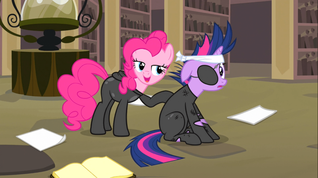 After Twilight Sparkle stares into the sun with one eye, Pinkie Pie provides her one of the eyepatches she has conveniently stashed all around Ponyville, fulfilling yet another part of the prophecy. Could it be that Pinkie Pie is secretly pulling the strings with this stable time loop? If you remember when I analyzed Feeling Pinkie Keen, there’s evidence that she knows a thing or two about fulfilling time loops too. I’ve seen theories that Celestia was secretly making sure this time loop was in order, but honestly Pinkie Pie makes so much more sense here. Everyone forgets that Celestia always has her hooves full with royal duties.