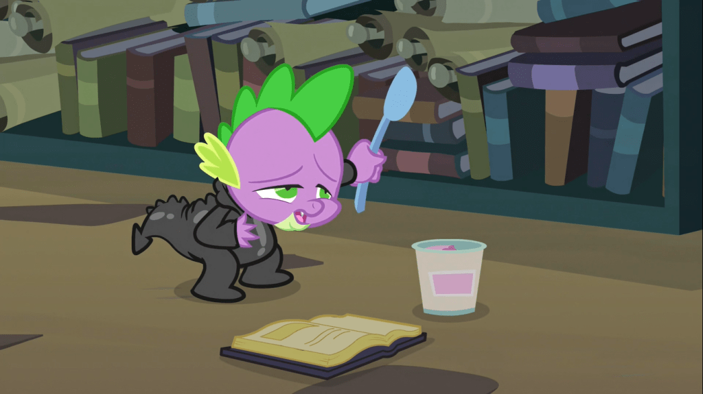 It’s not just other dragons who Spike eventually gets out of his comfort zone to befriend. There’s also Thorax who’s a pivotal step in peace with changelings, as well as a little male friend group with Big Macintosh and Discord. I’m not sure what the best real-world equivalent is to Spike getting out of his comfort zone, other than perhaps making friends who you have something in common with.