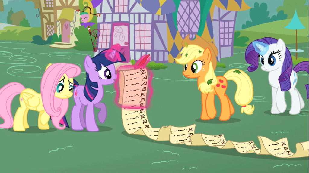 Then comes a montage where a bunch of characters (mostly the Mane 6 and some of their family members) work together to disaster-proof Ponyville. The montage has a few incredibly trivial tasks along the way and ends with the scene shown above. It looks like Twilight Sparkle’s friends have taken the lesson from Lesson Zero to heart: they paid attention to their friend’s worry and stepped up to help. Only Spike looks at all annoyed about helping Twilight go through this huge checklist, which is understandable because he’s known this pony his whole life and is well-accustomed to what sort of person she is.