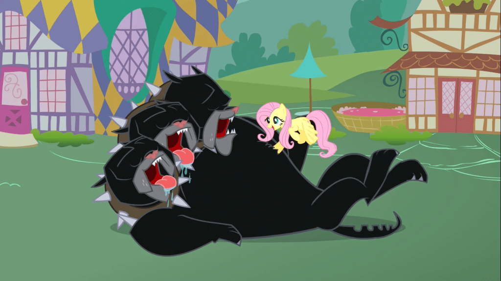 Right after the huge checklist has been gone through, a fearsome Cerberus comes into Ponyville… except in a supreme anticlimax, Fluttershy consoles the creature in her typical Fluttershy way that’s so easy to forget. Twilight Sparkle has a common habit of underestimating Fluttershy’s skill in dealing with huge beasts, and this episode is no exception. She also has a common habit of overestimating threats when she’s panicked, and if you think this episode is the slightest bit an exception, then I’m disappointed in you.