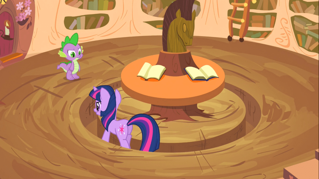 Twilight Sparkle may be annoyed that Pinkie Pie quickly shoved her into the library, but I think Pinkie did her a nice favor. Pinkie Pie probably knows that time is ticking and thus decided to expedite the process before time runs out. Maybe she knows that Twilight isn’t doing this just to find out what her birthday present will be, maybe she doesn’t; either way, she’s kindly speeding up matters here.