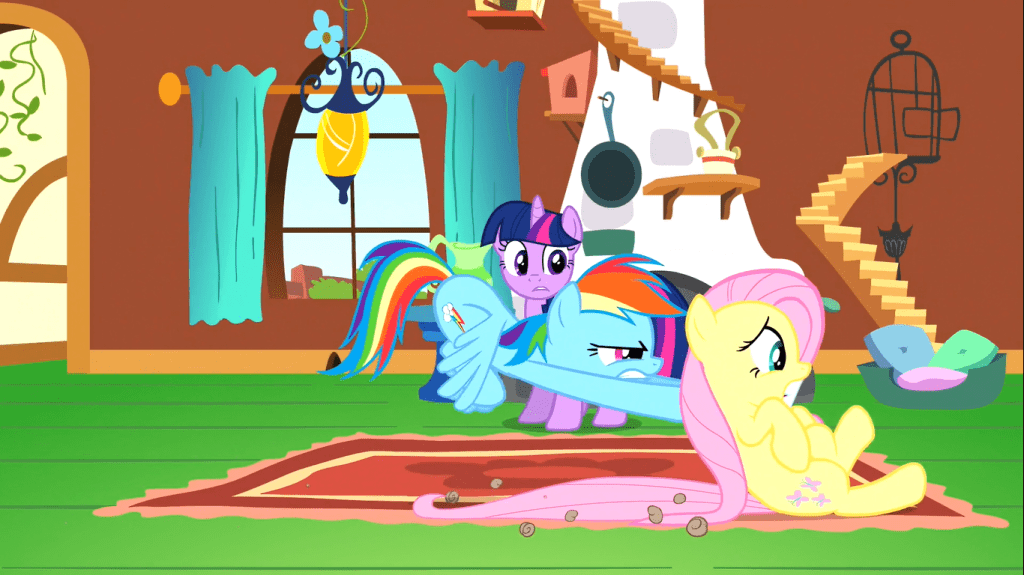 This episode starts with Twilight Sparkle and Rainbow Dash trying to convince Fluttershy to attend the once-in-a-generation great dragon migration until Fluttershy punches Rainbow Dash in the stomach, gently opens the window, and then runs away. It’s pretty funny how quickly Fluttershy can revert to her usual gentle self after her rare moments of action. At this point, it’s clear that Fluttershy is terrified of huge monstrous creatures unless her friends are in peril, in which case she springs to action. This opening scene tells us that you shouldn’t push someone to join an activity they want no part in, a moral that gets a full episode in Scare Master, but I’m getting ahead of myself. I can save my Fluttershy analysis for the next episode anyway.