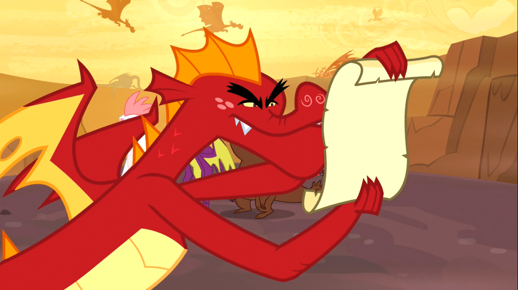 This piece of dialogue makes it clear that dragons don’t know any more about ponies than ponies know about dragons. As far as these dragons know, Celestia is just some random pony princess who probably acts as a damsel in distress, not the ruler of all of Equestria. This is an interesting byproduct of ponies referring to their leader as a princess instead of a queen, which was itself a result of the show’s executives refusing to call her Queen Celestia.