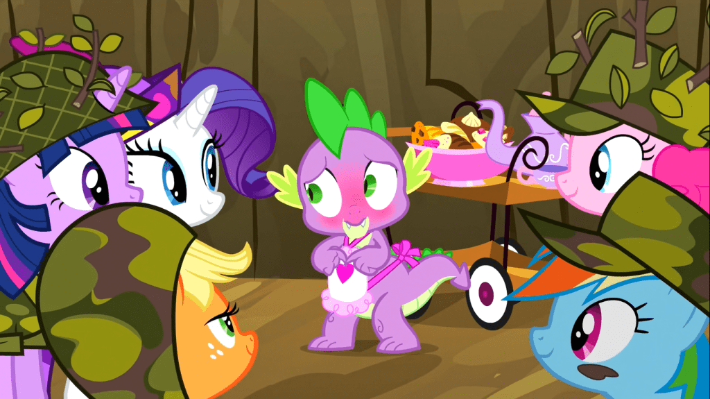 Rarity continues to say cute cuddly things about Spike, which drives him crazy, leading him to waddle away in anger as Rarity so puts it. His pony friends have the best intentions when trying to ease his nerves, unaware that Spike doesn’t want to be seen as cutesy and girly.