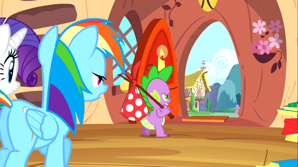 And so, Spike sets out on a journey of self-discovery. Rarity and Rainbow Dash try to stop him, but Twilight Sparkle agrees to let him go, which is rather nice of her. She’s known this dragon for most of her life and expresses far more sympathy for his side than the other ponies do. She also knows that books can’t teach you everything, as shown by the many friendship lessons she’s learned through real-life experience… and besides, she has a plan up her sleeve.
