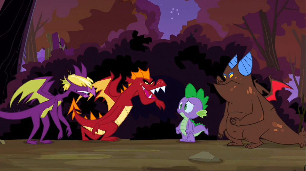 Then comes a sequence where a bunch of teenage dragons pick on Spike for being so small and weak and not having wings yet. How, you may ask, does this scene come off in retrospect knowing later episodes involving dragon culture? Well, for one thing, it’s clear that dragons’ typical way of life is incredibly different from that of ponies, making Spike come off as a fish out of water… or rather, a fish that spent its entire life out of water and is entering water for the first time.* He happened to stumble into an especially rowdy crowd of teenagers, perhaps because he thinks the age group directly above him would serve as good mentors or role models. The teenage dragons are most certainly friends with each other, holding belching contests and other tough athletic abilities, but they aggressively pick on those outside their group.