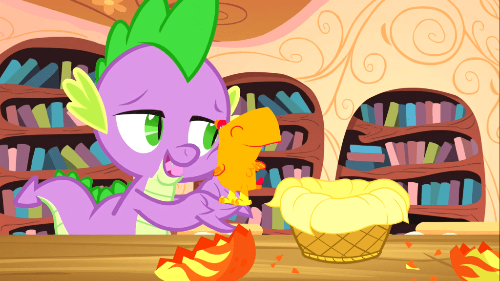 Spike then welcomes the newly hatched phoenix to the family and names him Peewee after an insult Garble gave him. Though this newfound pet relationship ends the episode, it doesn’t last long. While it takes four seasons for Spike to return to the dragon kingdom, it takes only one season for him to release Peewee, specifically in Just for Sidekicks, subverting the pattern of main characters having pets. I think his reason for releasing Peewee is that Spike probably doesn’t want that little phoenix to end up like him, lost and confused and out of place among his own species. It’s a kind and selfless gesture for him to let the phoenix grow up with its true species, but I may be getting ahead of myself.