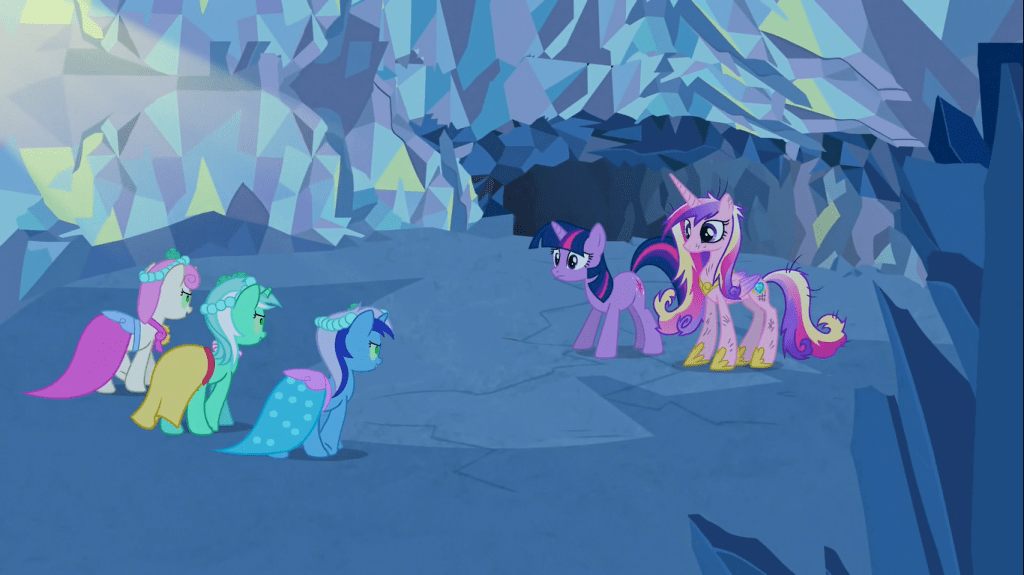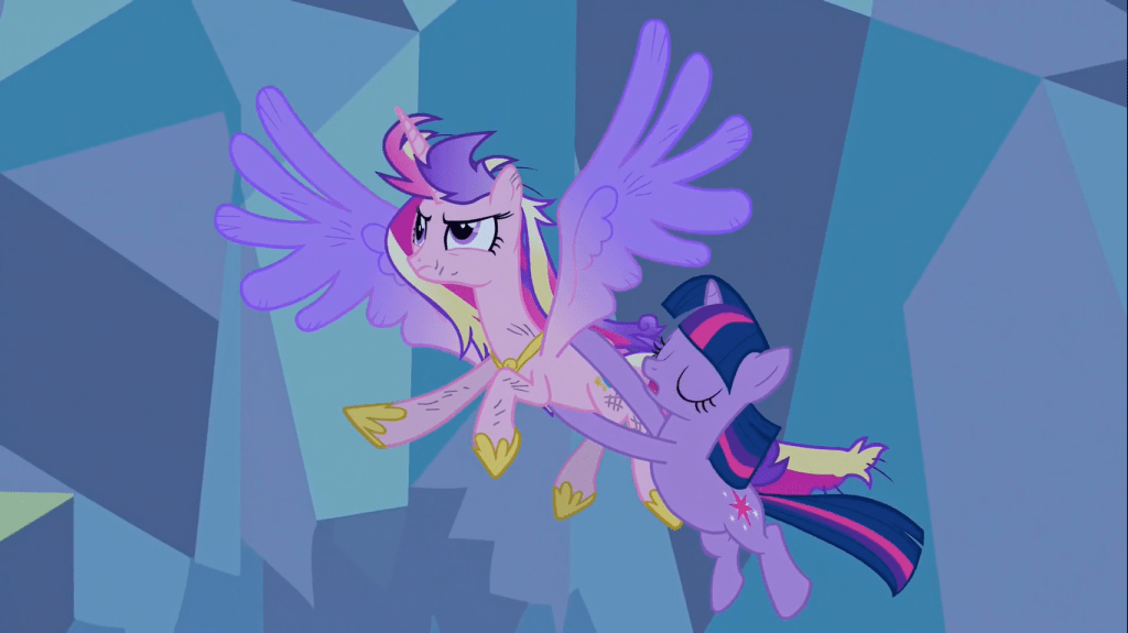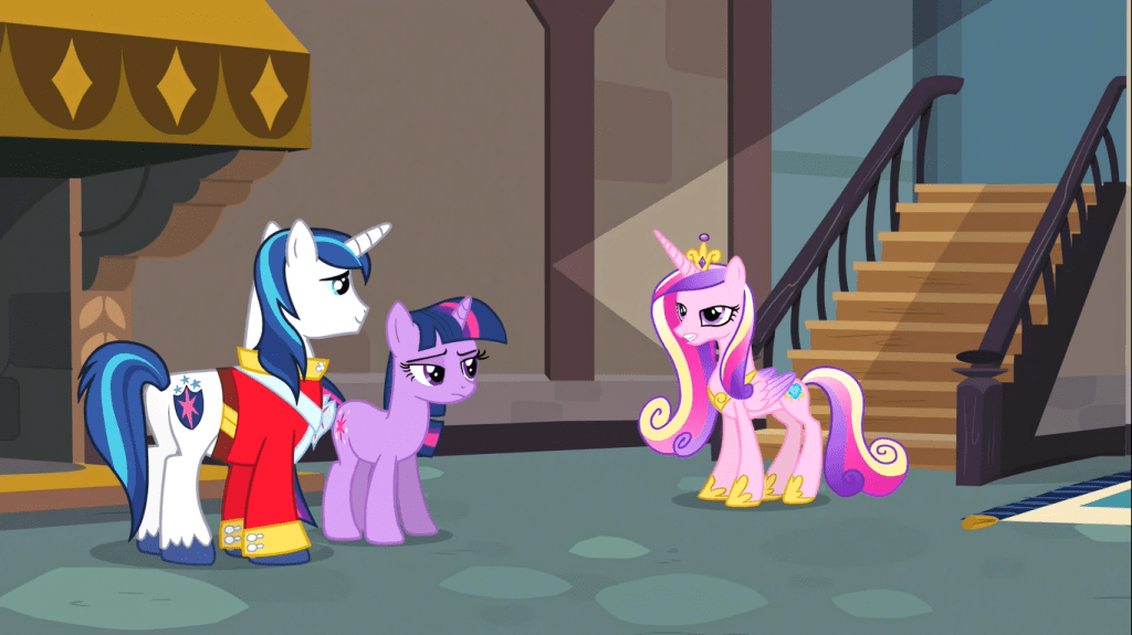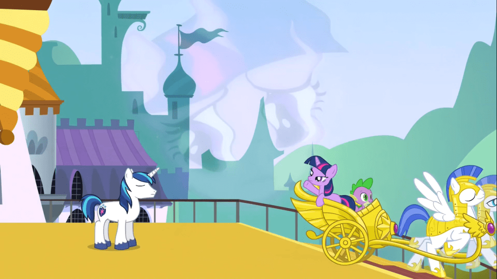 Before I move on to the part after the theme song, I’d like to say I’m perfectly aware that Cadance and Shining Armor were conceived of for the sake of selling toys, and that the show’s writers had to figure out how to work these new characters into the show’s continuity and make the most of them. From what I can tell, this was quite a strong pattern with the show’s production: the higher-ups demanded a change or addition to the show, and the writers took it into their hands to make these additions exciting and enjoyable for the show’s child audience and adult audience. I actually find it a pretty fun pattern; the same thing from what I know happened with such things as making Starlight Glimmer a major character and the School of Friendship. Starlight Glimmer’s integration into the show’s regular cast ended up a massive success, at least in my eyes. She’s an incredibly fun and rich character, but her debut is still a pretty long time from now, so maybe I shouldn’t go on about her just yet.