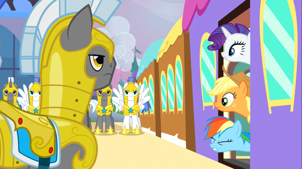When the train enters Canterlot, two royal guards have to clear the way as they pass through the city’s force field. The Mane 6 are surprised to see so many royal guards as they depart the train, which tells us that something isn’t quite right, and yet in the very next scene Pinkie Pie somehow sneezes out confetti, which I find hilarious. So far, this episode has done a very careful and deliberate job balancing the unsettling atmosphere with the show’s typical sense of humor, which arguably makes it even more unsettling.