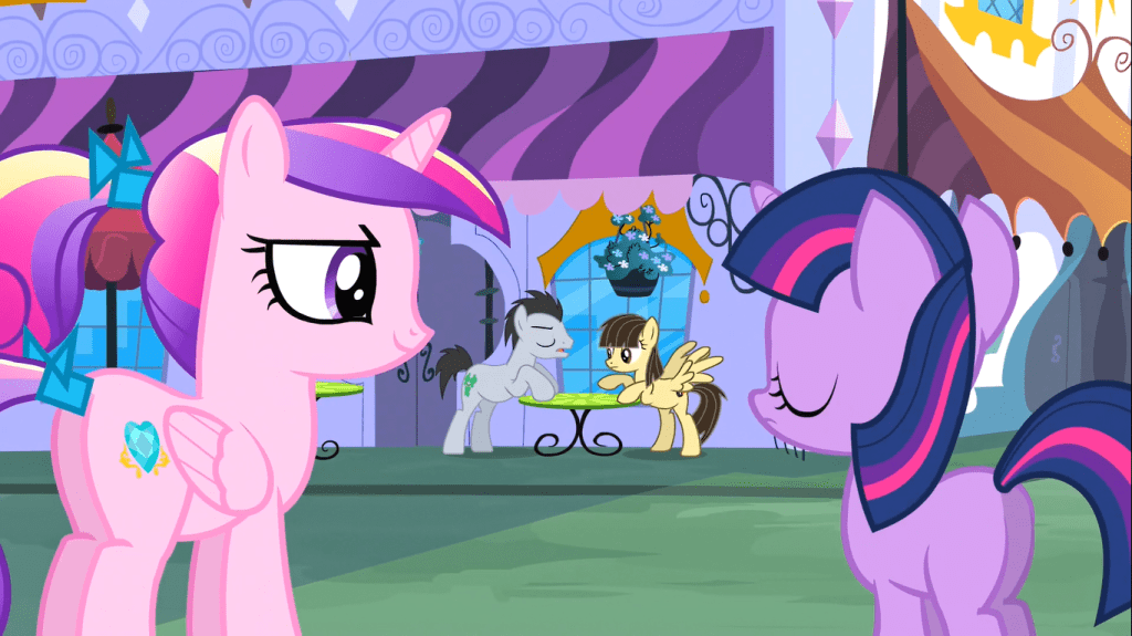 Twilight Sparkle then talks about Cadance’s unique ability to spread love wherever she goes, shown in a flashback where Cadance uses love powers to defuse an argument between a couple. It’s clear through this whole flashback how much Twilight Sparkle loved Cadance, and back in the present, she adorably bounces around in excitement.