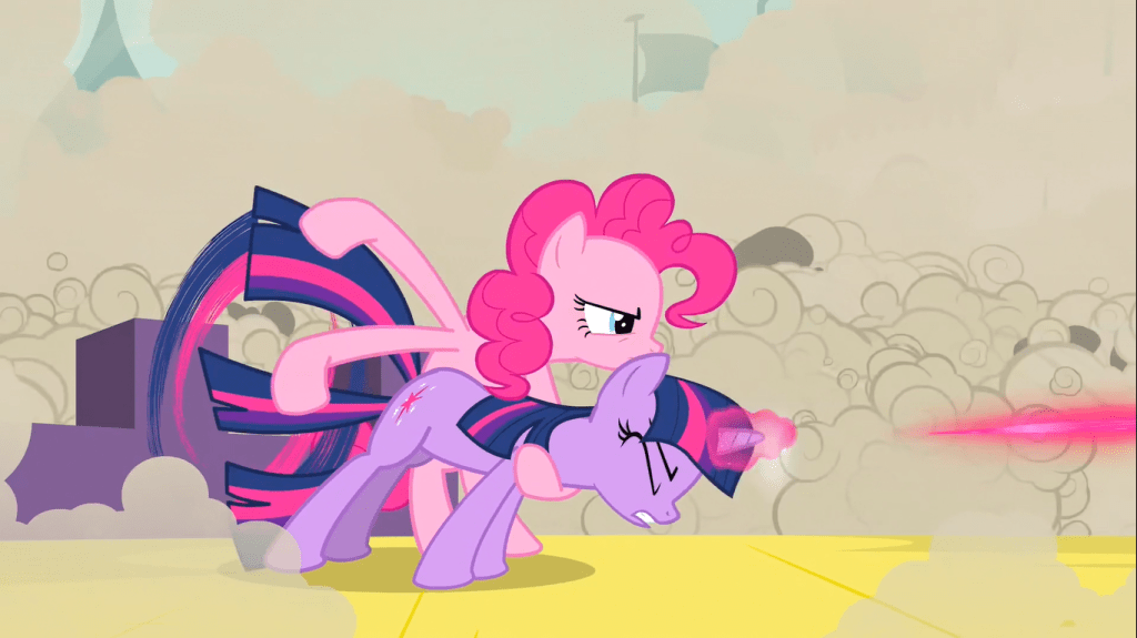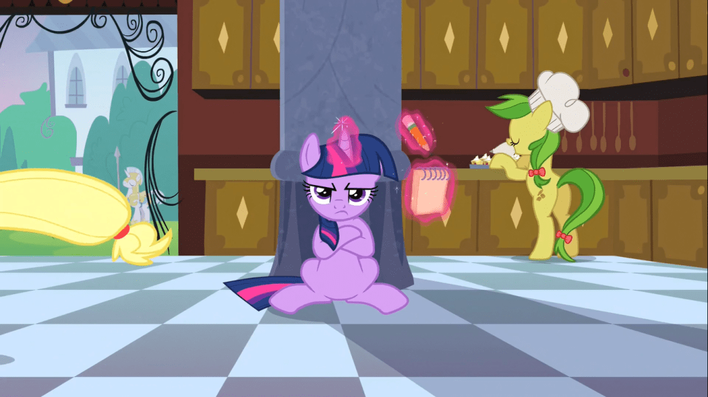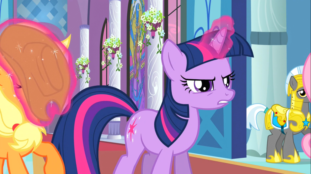 Twilight Sparkle has an interesting tendency to shove others out of the way when she’s aggravated.