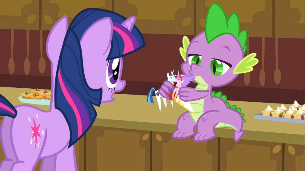 I love this little scene where Spike plays with the toy versions of Shining Armor and Cadance, meant to be put atop the cake. It playfully pokes fun at the show’s fans; the show knows that some of its male fans can’t resist getting some of the show’s merch and playing with it, and that some of them take a sense of humor in playing with the toys. This is much like Big Macintosh gleefully getting a hold of the doll Smarty Pants in Lesson Zero. Yes, somehow this scene doesn’t come off to me as solely a shoehorned advertisement for toys. It comes off as an advertisement for toys aimed at male viewers!