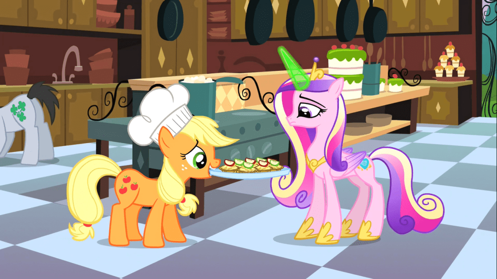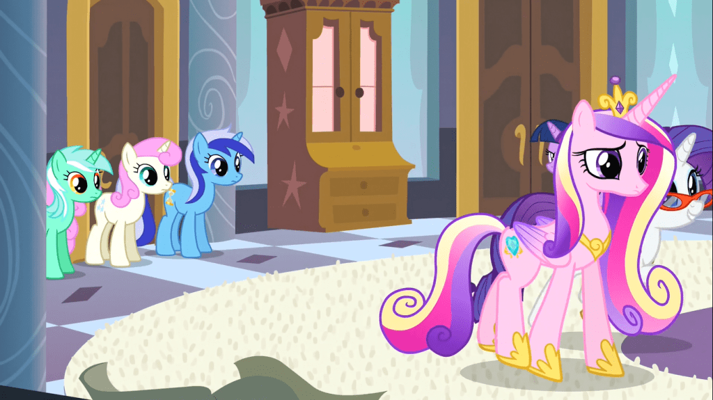 It’s clear that she’s disappointed with the dress’s initial reception, but fully expected this and keeps convincing herself that it’s right to follow her clients’ demands to the letter. This conveniently keeps Rarity busy, deterred from any insinuation that there’s something different about Cadance. I’d say more, but I would be rehashing my analysis of Suited for Success.