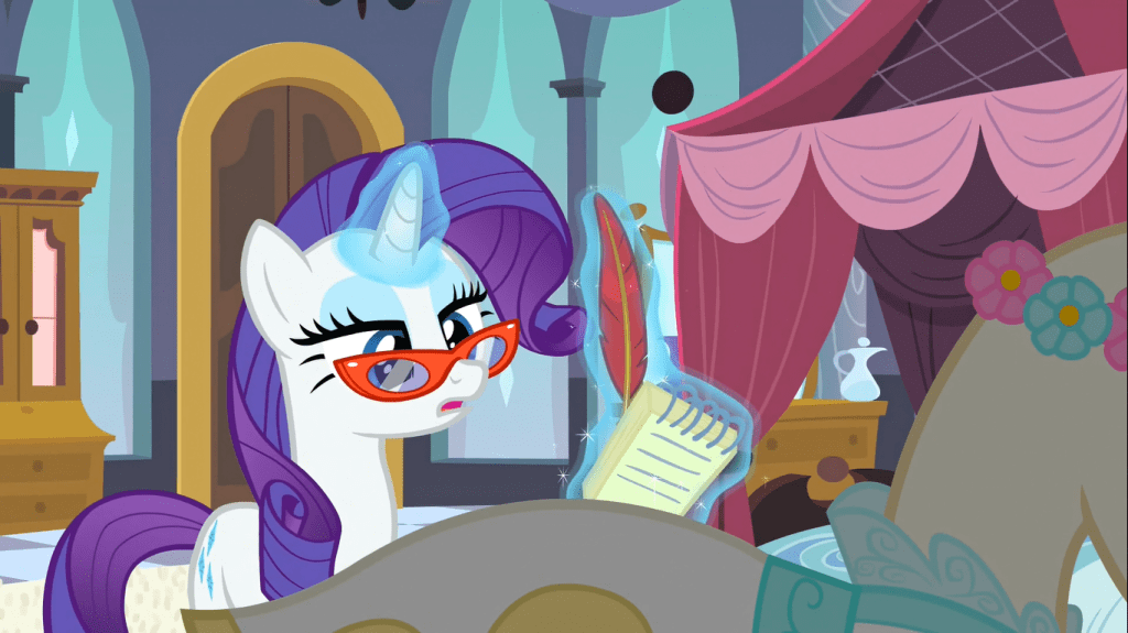 Here’s where we are reminded once more of the problem with Rarity. She’s all too willing to bend backwards for others at the expense of pleasing herself. If you look at her expression as she’s taking notes: