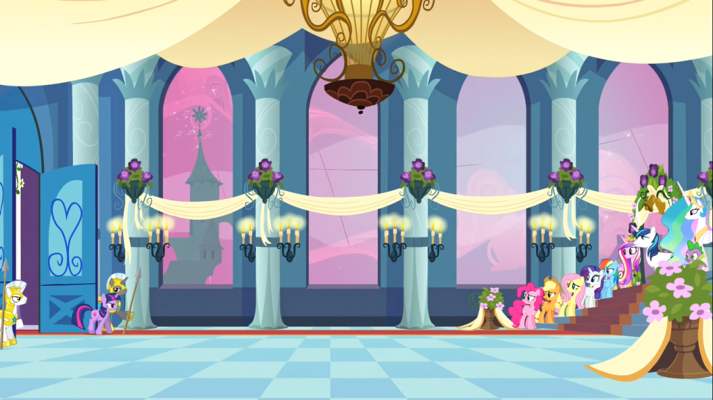 Twilight Sparkle reads the letter, correctly assuming it’s from Celestia. The letter is about a wedding, which causes Twilight Sparkle to only briefly pause. She’s surprised but excited that she and her friends are asked to help prepare for a wedding, and they’re all given roles very similar to those they were given for the Summer Sun Celebration in the first episode, like Fluttershy for music and Applejack for the catering. And unlike in the first episode, where the celebration was derailed by the return of Nightmare Moon, the wedding in part 2 of this episode has the Mane 6 perform their assigned roles exactly as planned, serving as the payoff for all the obstacles they faced.