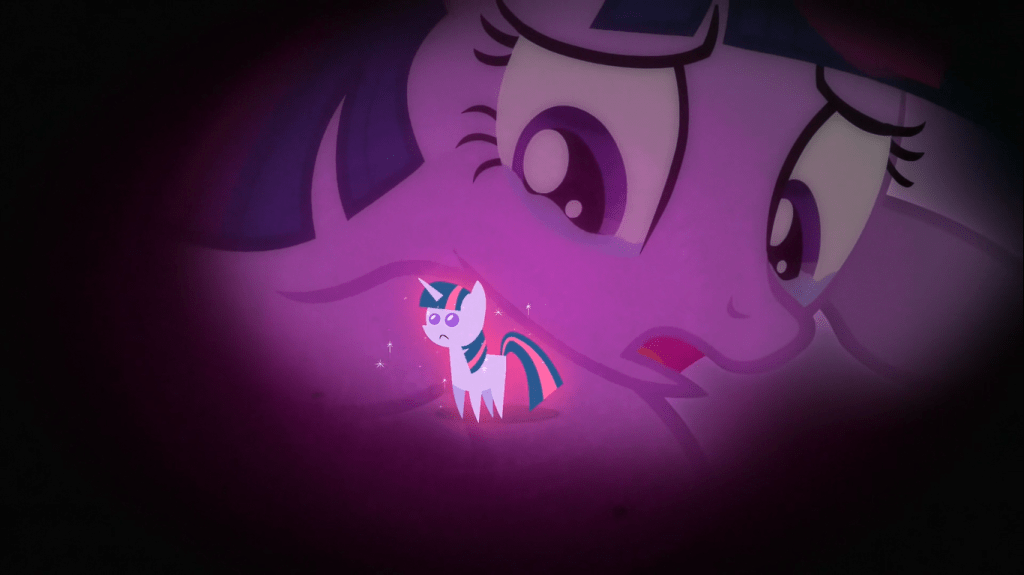 After thinking back to her moving out of Canterlot in the first episode, Twilight Sparkle starts crying as she realizes she misses her brother more than she had thought. I find this very believable. When you don’t see someone for a long time and stop thinking about them very much, if you start thinking about them at length again you can realize how much you’ve missed them this whole time; how much of a hole in your heart they left behind.