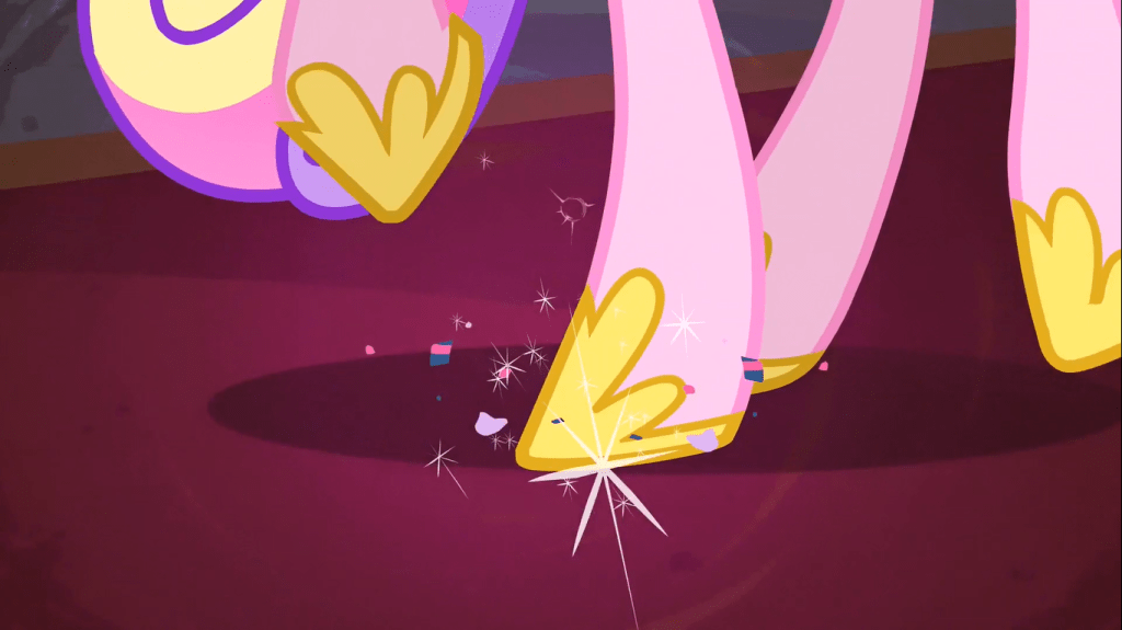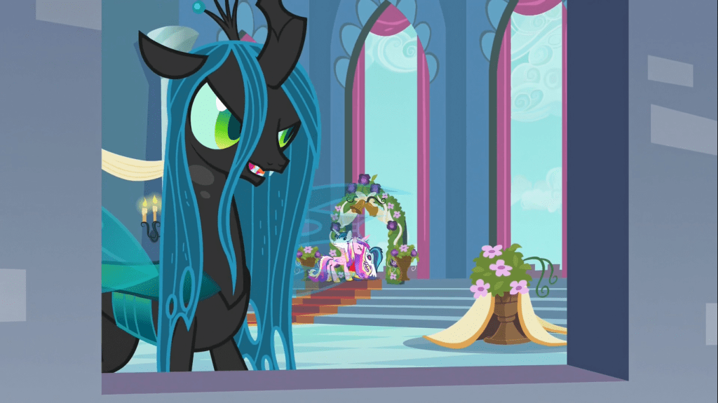 And to rub salt in the wound, “Cadance” briefly breaks the fourth wall by stomping on the rendition of Twilight Sparkle from her song, shattering it like glass. Fourth-wall interactions are rare in this show, and while they’re usually played for humor, this one helps portray Queen Chrysalis as villainous.