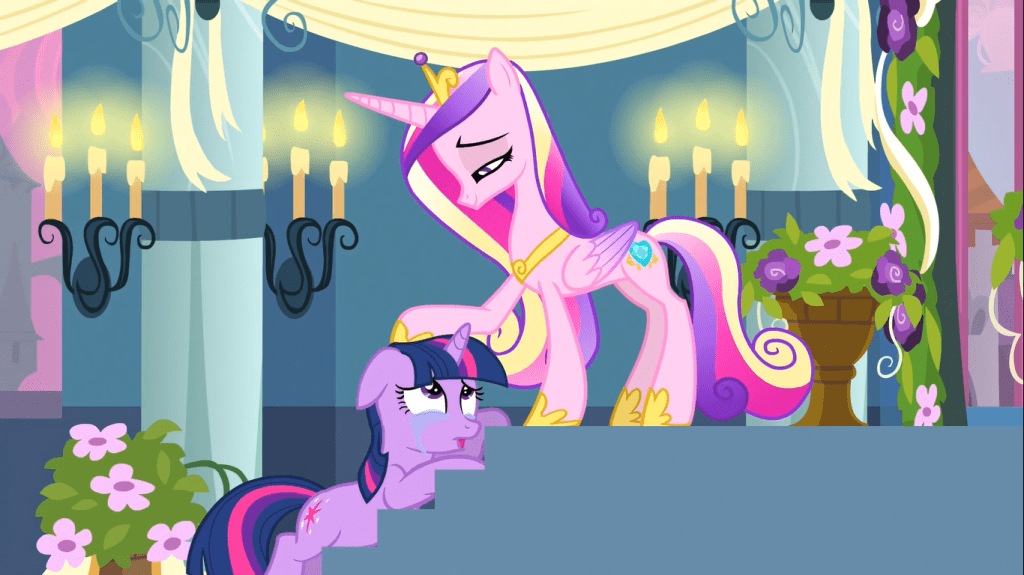 Part of Twilight Sparkle’s aggravation is because as far as she can tell, Shining Armor is getting married to a random princess she has never even heard of. But the fact that she doesn’t know who “Mi Amore Cadenza” is is really a testament to this princess’s humility: she prefers to simply go by “Cadance”, and through all the time she babysat Twilight Sparkle, she never felt a need to reveal her full name.