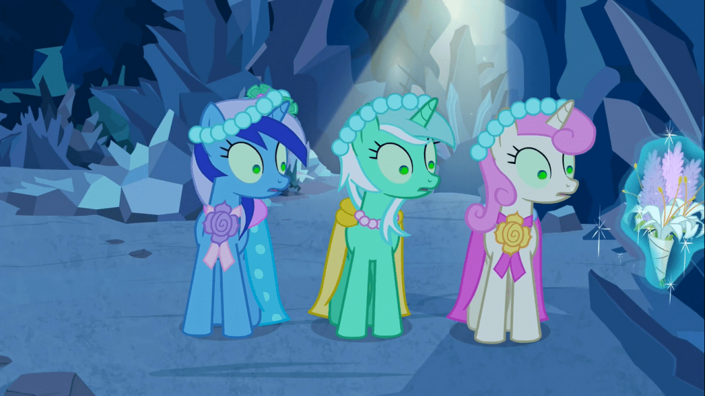 Twilight Sparkle sees a light up above the caves and teleports herself and Cadance up there, but they’re faced with Minuette, Lyra Heartstrings, and Twinkleshine behaving like zombies… or could they be changelings in disguise? For the first time in this post series’ history, I have a genuine reason to pull out the changeling excuse. It’s not only that we just saw two of these unicorns in the wedding’s audience; Queen Chrysalis is herself a changeling, and the unicorns’ eyes flashing green suggests that they may also be changelings, much like how “Cadance’s” eyes flashed green near the end of part 1.