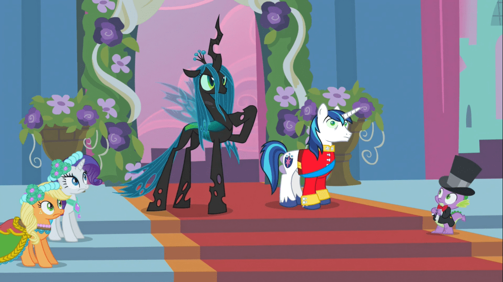If you look closely, in the front row you can see Twilight Sparkle’s parents (who are also Shining Armor’s parents, obviously). I feel like it’s a safe bet they don’t notice anything different about Cadance either, since the point of a babysitter is to watch over a child while their parents aren’t around. Aside from the groom himself, no one invited to the wedding knows Cadance nearly as well as Twilight Sparkle does. The last few measures of the musical number feature a split screen section where Queen Chrysalis gloats that Shining Armor will be hers.