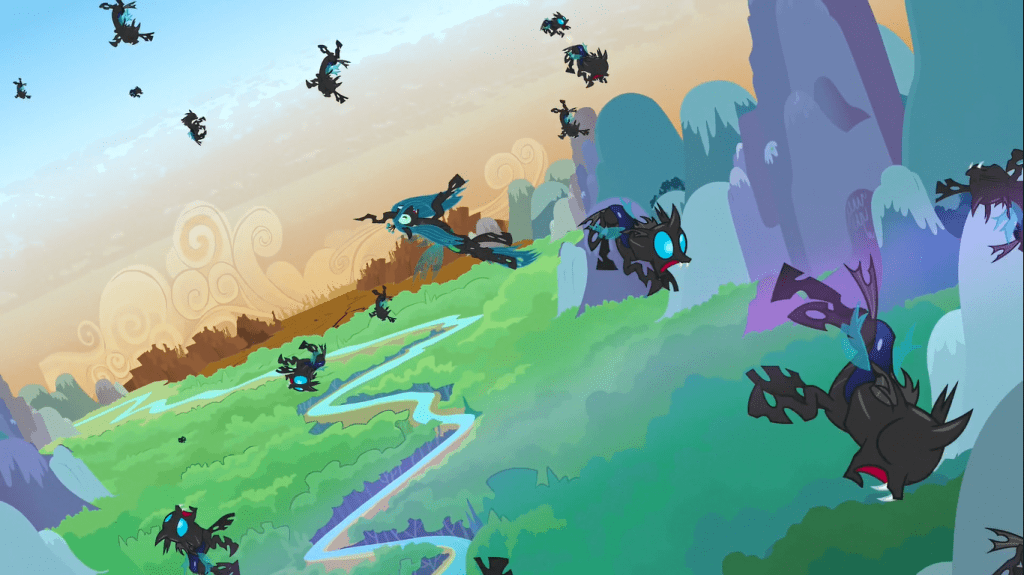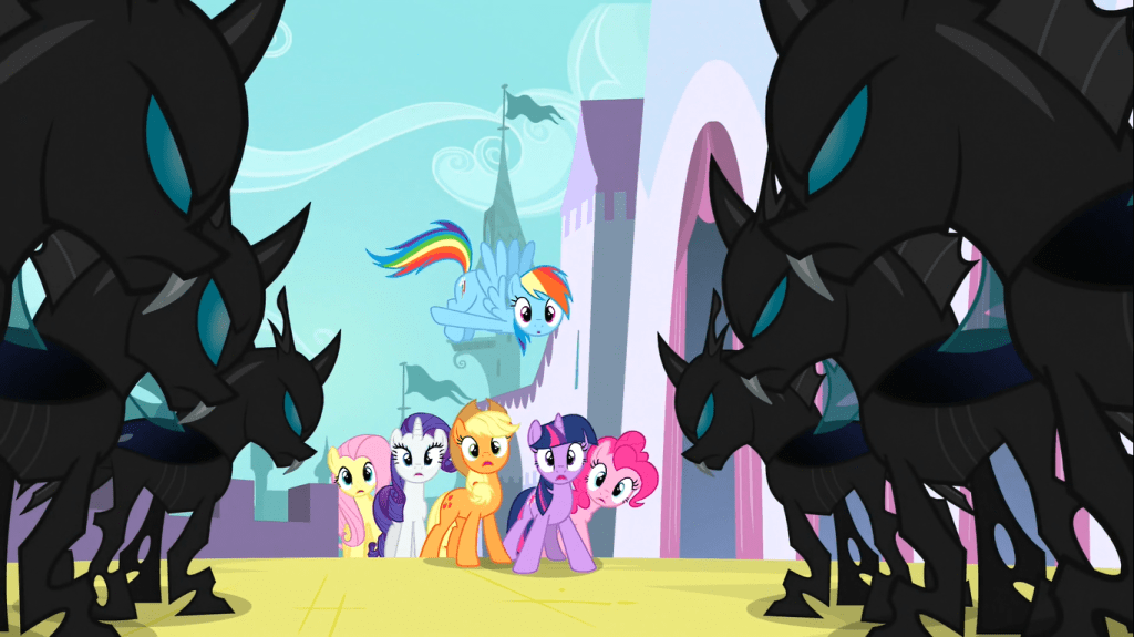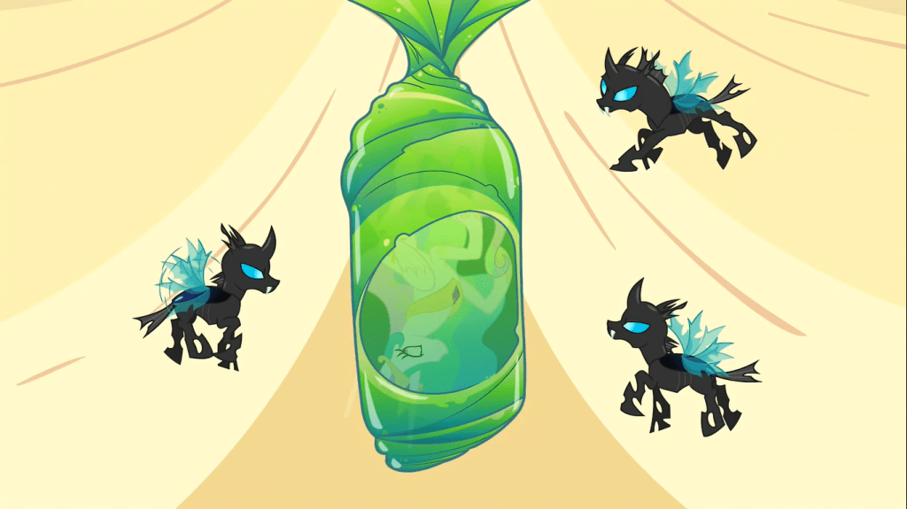 Can I just stop to say how terrifying changelings are? They’re easily one of the most terrifying things about the entire show. I find it incredibly tense and chilling whenever we see something seems noticeably off about a pony, or when there’s a bunch of apparent clones of the same pony (or non-pony character, of course), and a lapse of terror occurs whenever such a changeling reveals its true form. It’s the perfect balance of uncanny factors to scare viewers, and I love that MLP isn’t afraid to be scary. Kids like to be scared when watching shows, and the same holds true for adults.