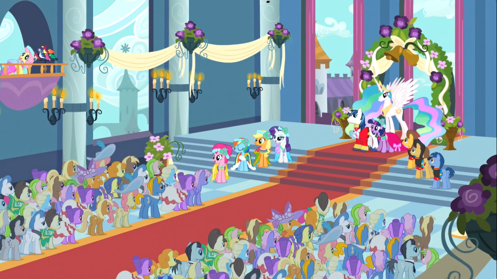 And then comes the catharsis. Upon Celestia’s instruction, the Mane 6 prepare for the real wedding in a quick montage, then the wedding occurs much like it did before, except with the real Cadance. Fluttershy is up on the balcony to conduct the singing birds, not just because she’s shy as I had previously thought… well, OK. Maybe also because she’s shy.