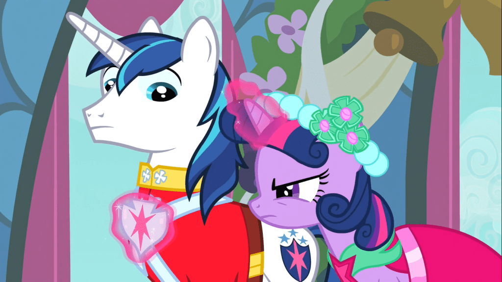 Pretending to be the kind-hearted bride, Queen Chrysalis runs off in tears, and then Shining Armor gives his sister a piece of his mind. He unknowingly lists the various excuses and lies Chrysalis came up with so she can take over the wedding, and chalks any rudeness on “Cadance’s” part up to wedding stress. He also goes on about how strenuous it has been maintaining the force field around Canterlot, and I’m starting to wonder if Chrysalis pushed him to maintain the bubble harder so that he would strain himself and stay occupied as she makes all the important “wedding decisions”. That would be appropriately villainous of her.