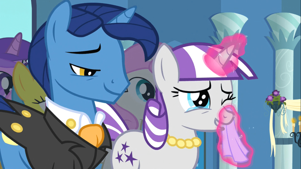 In a cute little scene, Twilight Sparkle demonstrates her obsession with detail by adjusting the label on Shining Armor’s suit, causing their parents to watch with tears in their mother’s eyes. These parents are evidently both thinking about how far their son and daughter have come, but at the same time how she’s still the same old Twilight Sparkle after all this time.