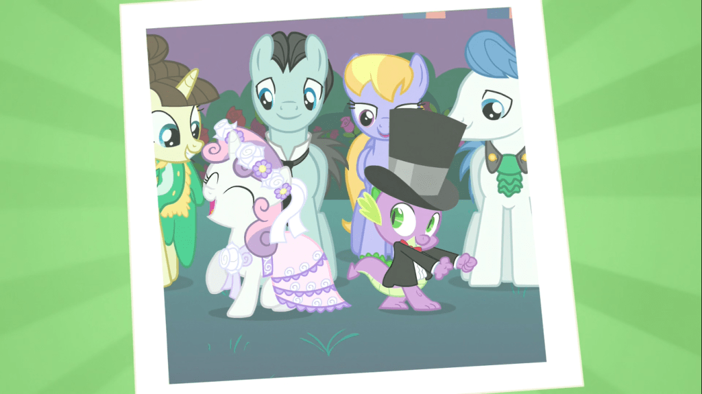 To cap things off, Luna arrives in the evening asking “did I miss anything?”, which humorously shows that there was no important role that she could play in this episode. Then, we get one last musical number: an electronic song, more electronic than anything else in the show so far, called Love Is in Bloom. The musical number is hosted by Pinkie Pie and, in a lapse of fanservice, our good friend Vinyl Scratch. I have no shame in admitting that this song is INCREDIBLY catchy and serves as the perfect catharsis for this episode. I’ll comment on the little that’s left of this episode mostly by captioning images, including a few from the song’s photo montage.