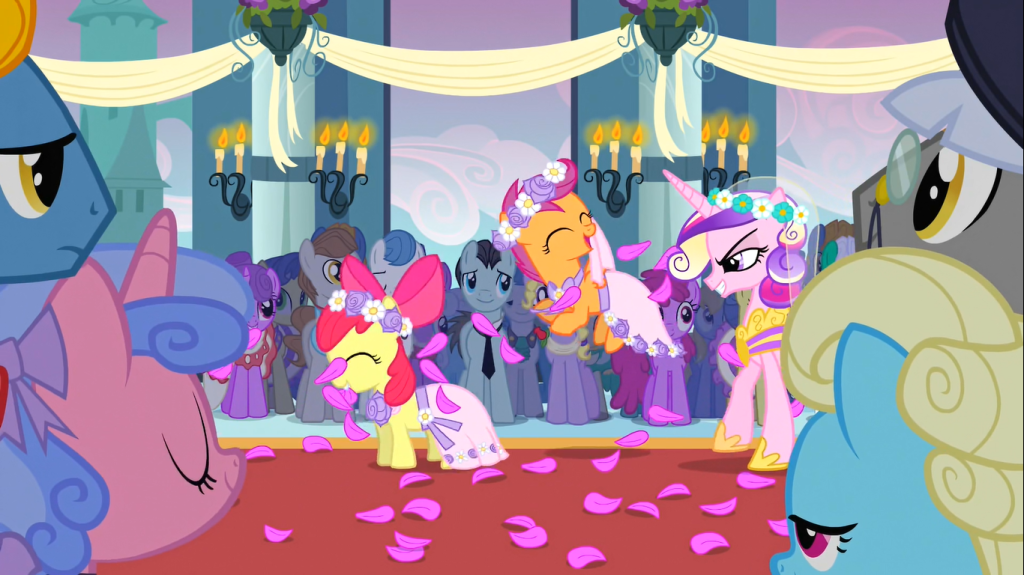 Aw, look at the Cutie Mark Crusaders bouncing around all happily. They know even less about Cadance than most of the Mane 6 do. Perhaps they eagerly joined in on the wedding because they thought they would get their cutie marks in wedding planning? Or, um, whichever wedding role these three have. It probably shows that I haven’t been to very many weddings.