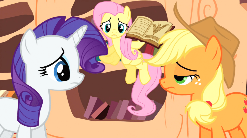 The rest of the Mane 6 and Spike search Twilight’s place for books about Trixie’s magic, and after some struggling, Fluttershy finds it and tries to explain it only to keep getting interrupted. Then Spike snatches the book and everyone starts paying attention. Normally I’d feel bad for Fluttershy in such a scene, but this time I can’t help but find it hilarious how soft-spoken she remains. She tries to interject further as Spike reads the book but is only interrupted more. The ponies learn that only the wearer of the amulet can take it off, which presents a conundrum.