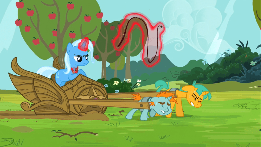 Trixie forces Snips and Snails to pull her on a cart without wheels, even using a whip on them (but in a kid-friendly way where the whip doesn’t hit them). Maybe Trixie is deliberately punishing them since they’re responsible for ruining her image by bringing an Ursa Minor to Ponyville? She’s taking her anger out on Snips and Snails in an especially cruel way. While she views Twilight Sparkle as a worthy rival, she views Snips and Snails as the idiots who ruined her life.