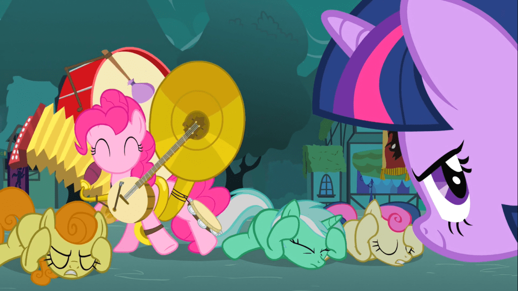 Twilight Sparkle then uses a magic spell to make Pinkie Pie play ten instruments at once. Attentive viewers will remember Swarm of the Century, where she was already able to do that. What good is a surprise twist in any work of media without some sneaky foreshadowing?