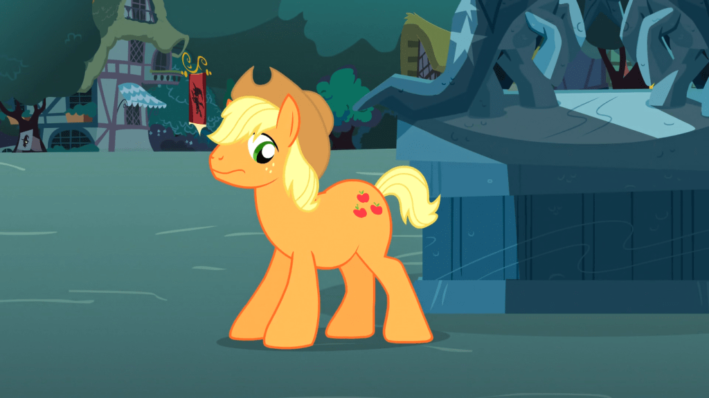 Twilight Sparkle’s final magic spell is turning a mare into a stallion. While Applejack puts on a convincing act of trying to run away in panic then looking woozy when changing back, Big Macintosh dressed as Applejack endearingly slips out of character when he says “eeyup”. He doesn’t interact with most of the Mane 6 much, so it makes sense that he feels a little awkward in this scene.