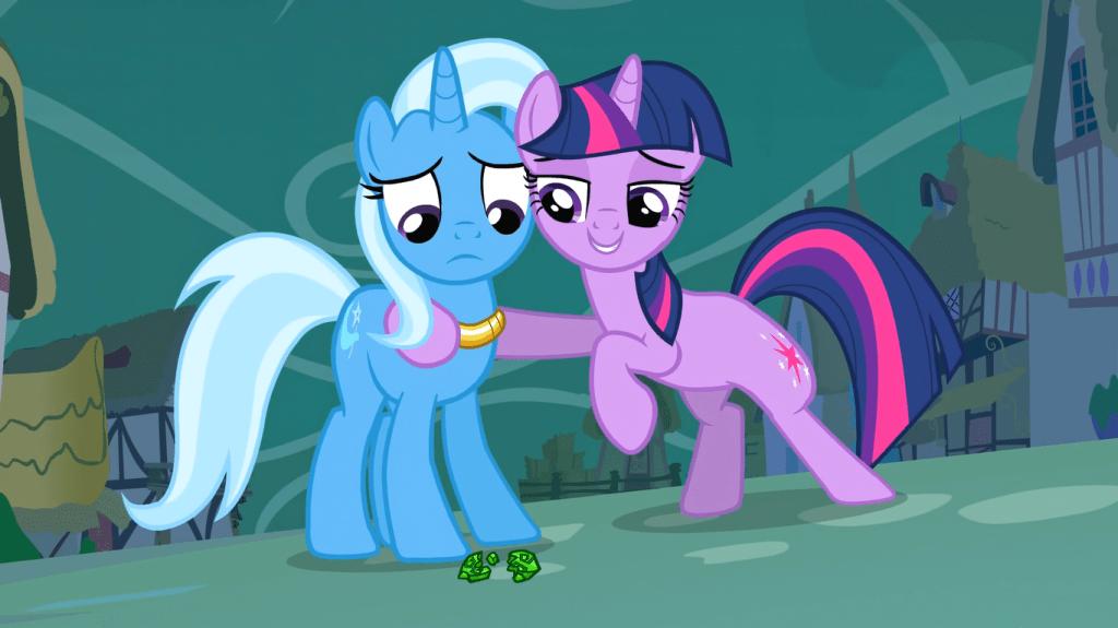 Cementing this episode as a sequel to Boast Busters, Trixie shows up and performs magic tricks on Twilight’s friends (and Snips and Snails) more powerful than last time, then has a confrontation with Twilight, who again insists she isn’t interested in challenging Trixie.