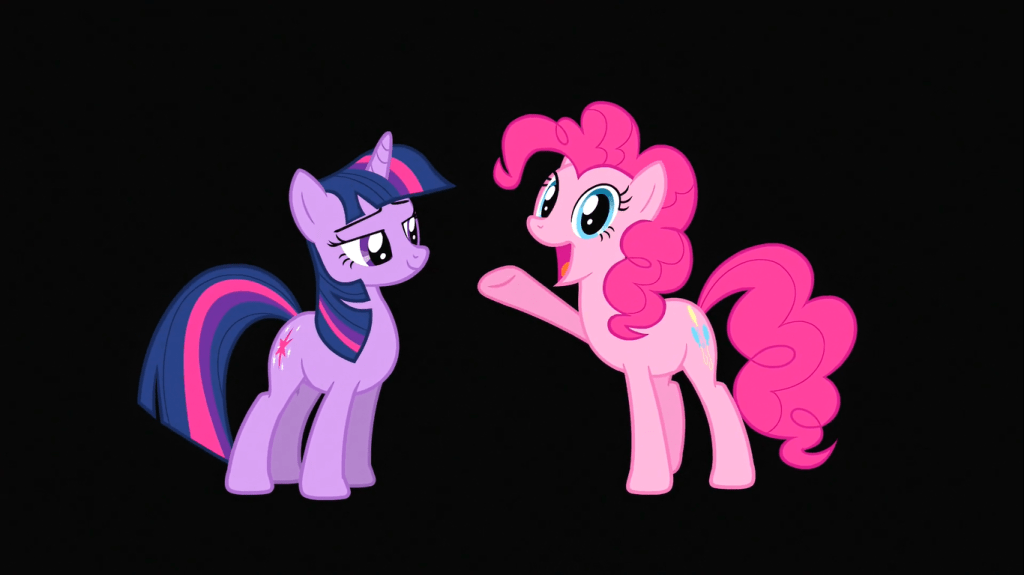 And this episode ends with Pinkie Pie breaking the fourth wall. She squeezes her way out of the camera closing in on the moon and enters the black space where the credits take place, then Twilight Sparkle joins her and gives Pinkie her mouth back. This is a fun way to tie the last loose end, and a rare case of someone other than Pinkie Pie breaking the fourth wall.