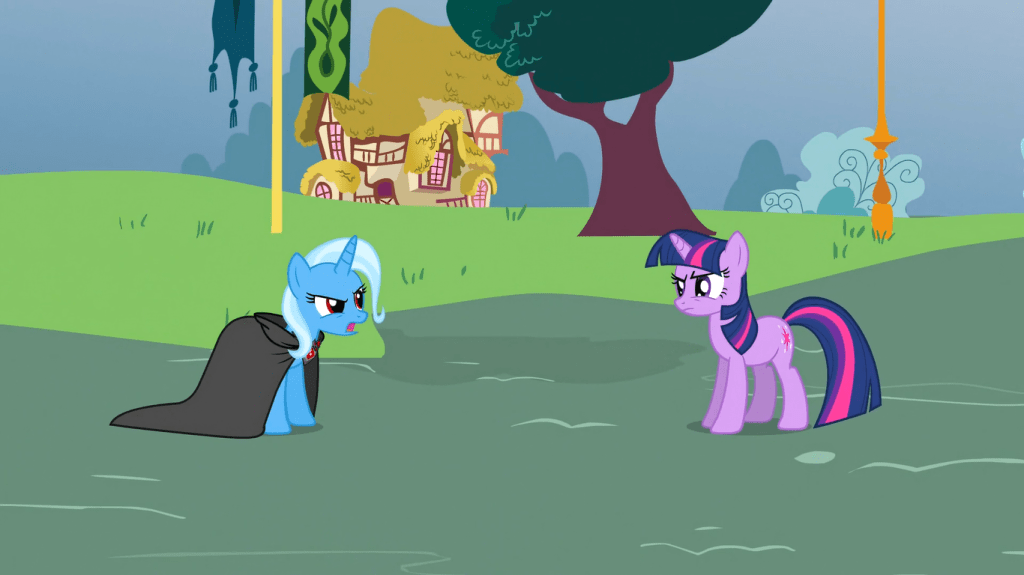 Twilight Sparkle loses the duel and is forced out of Ponyville, with Trixie even surrounding the city with a protective dome. Twilight can tell there’s something strange about Trixie, which is interesting because she only met Trixie once before. I guess Trixie really left a lasting impression on her, huh? When two characters in a show have a petty rivalry, one of which is a main character and the other a recurring character, chances are that the recurring character knows exactly how to get under the main character’s skin, and that the recurring character insists the main character is deep down obsessed with them.