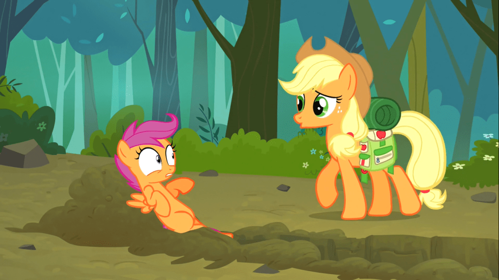 Scootaloo goes ahead of the others with her scooter but falls asleep, and after a few slapstick sequences, she ends up back where she started and falls off her scooter. She’s very jumpy and panicky, but she tries to deny it and make up a bunch of lies, which is highly reminiscent of Rainbow Dash. While this episode at first seems to contrast Rainbow Dash and Scootaloo, it ultimately shows how much they are alike.